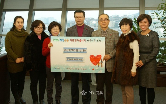 서울 용산구가 '2015 희망온돌 따뜻한 겨울나기 사업'을 추진 중인 가운데 최근 용산파크타워 부녀회 및 경로회 관계자들이 용산구청내 구청장실을 방문해 300만원의 성금을 기탁하며 성장현 용산구청장과 기념촬영을 하고 있다. (사진제공=용산구청)