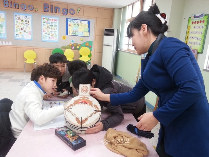 경기 부천시 석천초등학교가 겨울영어캠프를 운영 중인 가운데 8일 학생들이 몽골인 강사로부터 몽골문화에 대한 설명을 듣고 몽골전통가옥인 게르 모형을 직접 만져보며 몽골의 전통문화를 체험하고 있다. (사진제공=부천교육지원청)