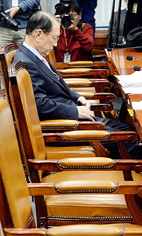 김기춘 대통령 비서실장이 9일 오전 서울 여의도 국회 운영위원회에 출석해 회의 시작 전 생각에 잠겨 있다. 김기춘 실장은 이날 오전에 열린 현안보고에서 “청와대 문건 유출과 관련해 국민께 송구하고 깊이 자성한다”고 밝혔다.