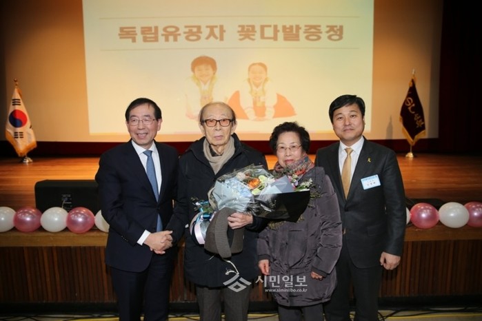 서울 성북구는 지난 8일 오후 2시 구민회관 대강당에서 정릉2동의 창작뮤지컬 '태평가' 공연과 함께하는 특별한 신년인사회를 진행했다. 사진은 이 자리에 참석한 김영배 성북구청장(오른쪽)과 박원순 서울시장(왼쪽)과 성북구에 거주하는 최고령 독립운동가인 이윤장 선생(왼쪽 두번째)의 모습. (사진제공=성북구청)