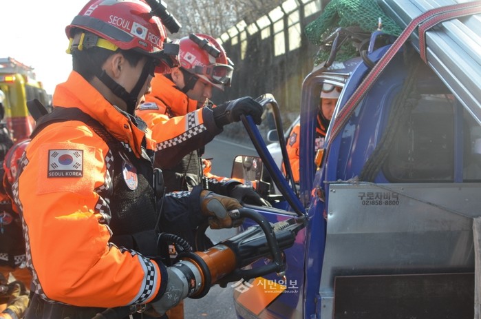 서울 강남소방서 소속 소방대원들이 12일 낮 12시30분께 올림픽대로 잠실방향에서 발생한 4중 추돌 교통사고 현장으로 출동해 0.5톤 트럭에 끼어 있는 요구조자 1명을 유압장비를 이용해 구조하고 있다. (사진제공=강남소방서)