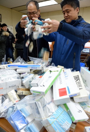 12일 담배 절도범 검거 브리핑이 열린 전북지방경찰청에서 경찰이 압수한 담배와 증거물품을 정리하고 있다.