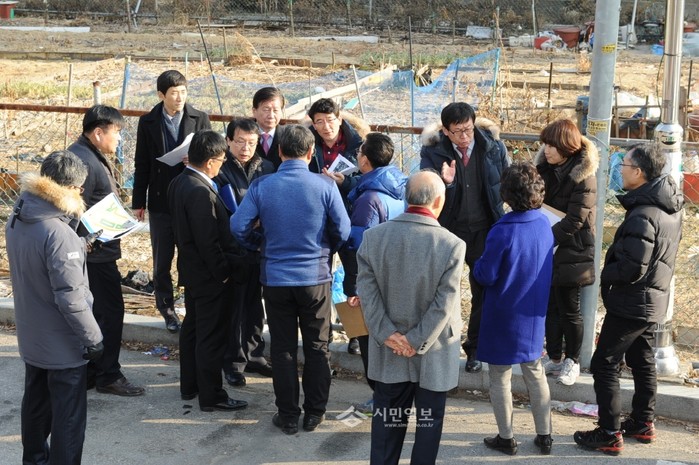 | ▲ 수원시의회 연구단체 ‘장기미집행 도시계획시설 검토 연구회’ 의원들이 현장을 방문해 여러가지를 살펴보며 논의하고 있다.(사진제공=수원시의회) | ||