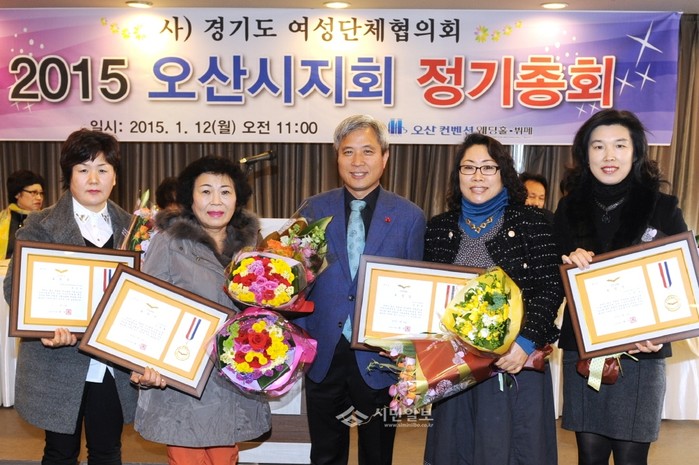 경기 오산시는 12일 오전 오산컨벤션웨딩홀에서 지난해 여성단체별 사업실적을 평가하고, 올해 새로운 사업 계획 수립을 위해 ‘여성단체협의회 정기총회’를 개최했다. 사진은 이 자리에 참여한 곽상욱 오산시장(가운데) 및 관계자들이 기념촬영을 하고 있는 모습. (사진제공=오산시청)