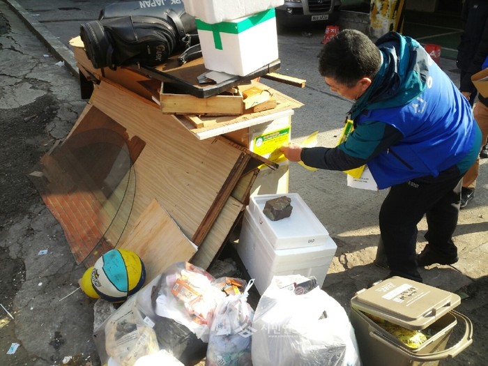 최근 경기 부천시 오정구 신흥동 주민센터는 생활 쓰레기 수거체계가 거점방식에서 문전수거방식으로 변경됨에 따라 직원 및 통장들과 함께 신흥동 일대를 대상으로 '문전수거 홍보 캠페인'을 실시했다. 사진은 홍보물을 부착 중인 모습. (사진제공=부천시청)