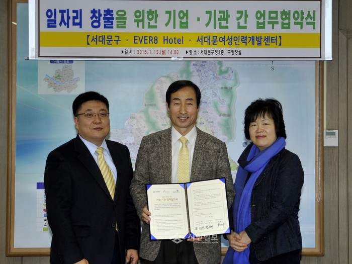 지난 12일 서울 서대문구 구청장실에서 문석진 서대문구청장(가운데)이 신촌 EVER8 레지던스호텔 장문익 대표이사(왼쪽)와 서대문여성인력개발센터 박정숙 관장과 함께 5060세대 일자리 창출을 위한 업무협약을 맺은 후 기념촬영을 하고 있다. (사진제공=서대문구청)