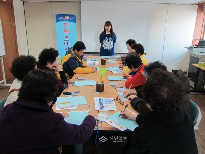 | ▲ 서울 관악구에서 연중 운영하는 치매관리사업 가운데 하나인 '기억 르네상스' 참가자들이 교사의 재능기부를 통해 교육받고 있다. (사진제공=관악구청) | ||