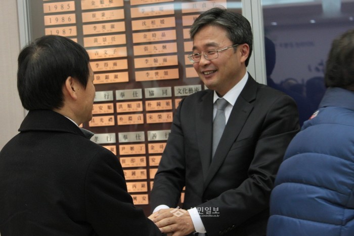 14일 오후 1시30분 서울 은평구가 각계 대표 및 지역주민 1500여명을 초청해 5층 은평홀에서 개최한 '2015년 신년회'에 참석한 김우영 구청장이 신년회 시작 전 리시빙 라인에 서서 지역주민들 한 명 한 명과 손을 잡고 인사를 건네고 있다.