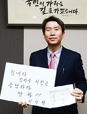 새정치민주연합 당 대표 후보인 이인영 의원이 14일 오전 서울 여의도 국회의원회관 사무실에서 쌍용차 해고 근로자에 대한 지원과 사태 해결을 위한 쌍용차 챌린지를 하고 있다.