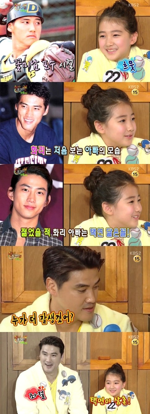 이에 홍화리는 "이상하다"며 낯선 아빠의 사진을 신기하게 바라봤다. 이어 MC들은 "택연 삼촌이랑 비슷하지 않냐. 누가 더 잘 생겼냐"고 물었고 홍화리는 망설임 없이 "택연이 삼촌"이라고 말해 홍성흔 선수에게는 좌절을, 다른이들에게는 웃음을 안겼다.