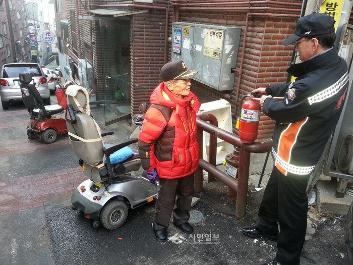 인천 남동소방서가 최근 고지대 주거밀집지역 소방안전대책의 일환으로 주택이 밀집하고 신속한 출동이 어려운 간석시장 인근지역 등 고지대 3곳에서 취약계층의 안전을 확보하기 위한 화재 예방 요령, 화재시 대응 요령 등의 홍보활동을 실시했다. 사진은 소방대원이 한 주민에게 소화기에 대해 설명 중인 모습. (사진제공=남동소방서)