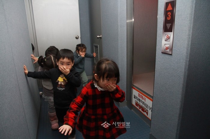 동작소방서가 16일 오전 10시 동작소방서 3층 안전체험교실에서 동광어린이집 원아들을 대상으로 소방안전교육을 실시했다. 사진은 동광어린이집 어린이들이 연기 속에서 대피체험을 하고 있는 모습. (사진제공=동작소방서)