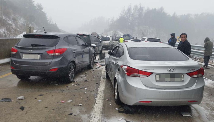 지난 16일 오전 10시17분 중앙고속도로 대구방향 345㎞지점 횡성군 공근터널 인근에서 차량 43대가 추돌하는 사고가 발생해 현장에 차들이 뒤엉켜있다.