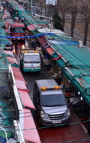 16일 오후 서울 송파구 석촌시장에서 송파소방서 대원들이 화재시 소방차 통행로 확보 훈련을 하고 있다.
