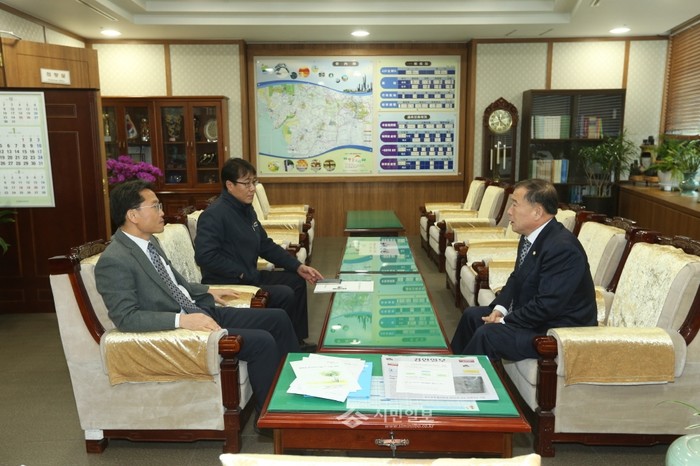 16일 한국수자원공사 송산건설단(왼쪽)이 박종선 경기 화성시의장(오른쪽)을 방문해, 계획인구 15만명을 수용할 수 있는 대단위 신도시 개발 사업인 송산그린시티 사업에 대해 설명하고 있다.(사진제공=화성시의회)