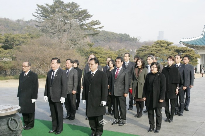 서울 서초구의회 의원들이 최근 현충탑 참배를 위해, 동작동 국립현충원을 찾아 현충탑에 헌화·분향 후, 조국을 위해 몸을 바친 순국선열 및 호국영령에 대한 묵념을 하고 있다.(사진제공=서초구의회)
