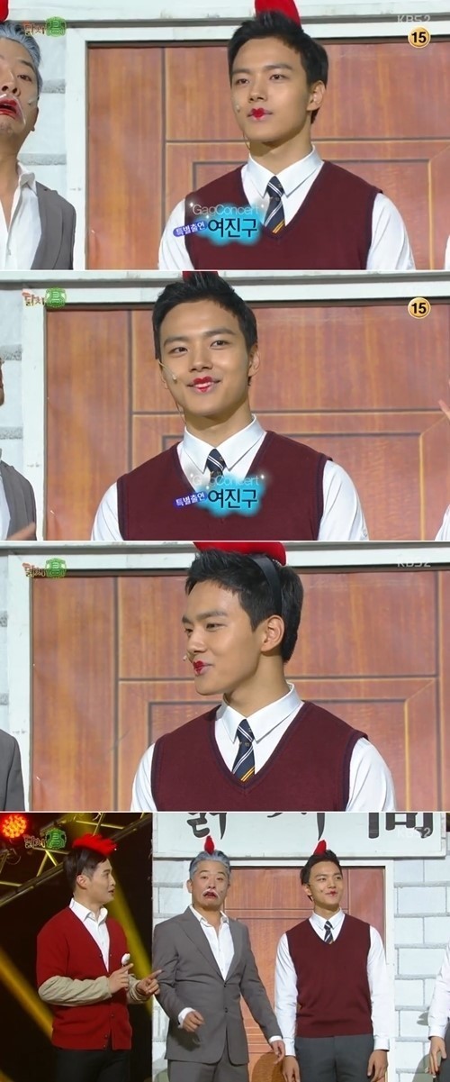 18일 방송된 KBS2 '개그콘서트-닭치高'에서는 영화 '내 심장을 쏴라'로 돌아온 여진구가 깜짝 출연했다. 이날 여진구는 닭 분장을 하고 전학생 영계백숙으로 출연했다.