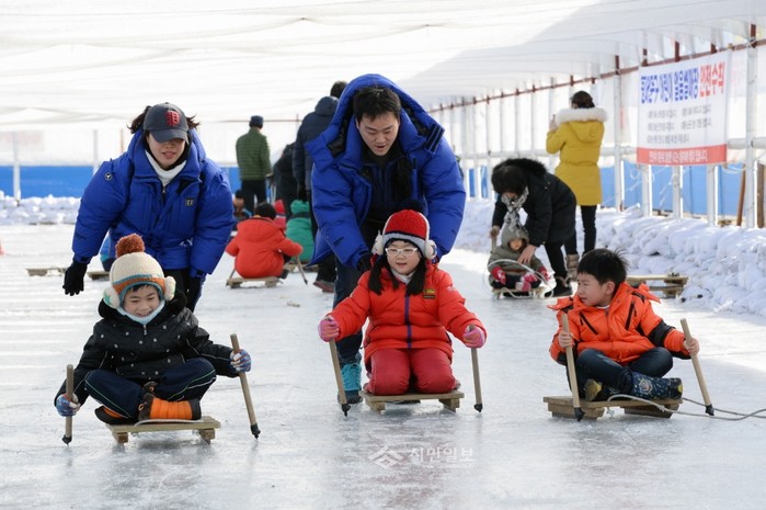 서울 동대문구가 지난 2일 겨울방학을 맞이해 중랑천 둔치 체육공원에 얼음썰매장을 개장했다. 얼음썰매장은 오는 2월13일까지 운영된다. 입장료는 무료이며 썰매는 대여료 1000원이면 이용이 가능하다. (사진제공=동대문구청)