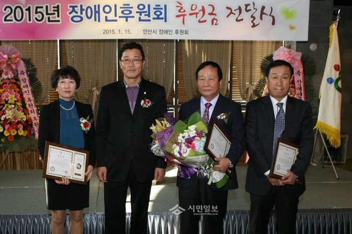 | ▲ 안산시의회 신성철 부의장이 장애인 후원회에 참석해 우수 봉사자들에게 표창장을 전수했다. | ||