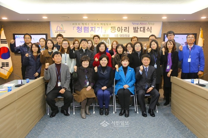 최근 서울 서초구가 청렴도를 높이기 위해 내부 직원 30명의 자발적인 참여로 만들어진 ‘청렴지기 동아리 발대식'에 참가한 조은희 서초구청장(앞줄 가운데)이 직원들과 함께 기념촬영을 하고 있다.(사진제공=서초구청)