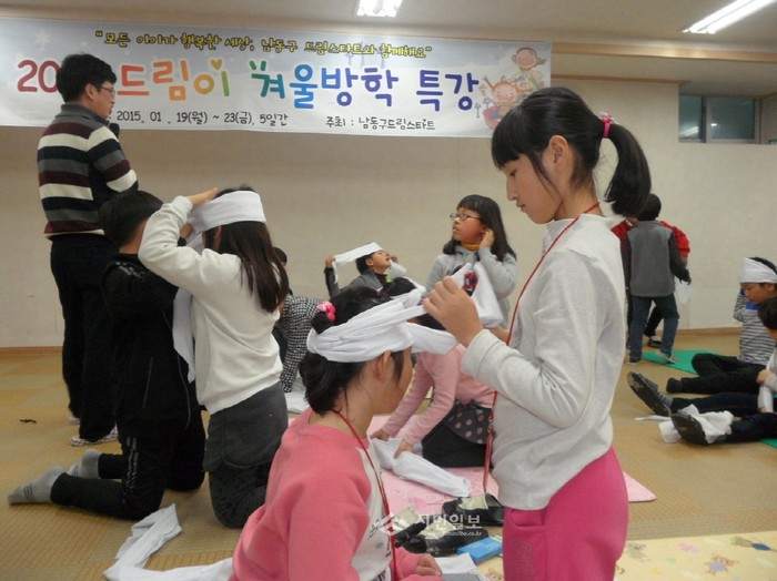 인천 남동구가 지난 19일 겨울 방학을 맞아 드림스타트 아동 30명을 대상으로 응급상황에서의 대응능력을 키우기 위한 심폐소생술·삼각건 사용법 등의 응급처치교육을 실시했다. 사진은 강사의 지도를 받아 삼각건 사용법을 실습하는 아이들의 모습. (사진제공=남동구청)