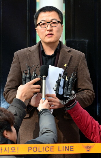 경찰이 종북 토크쇼 논란으로 구속된 황선 희망정치연구포럼 대표의 남편 윤기진 민주 민생 평화통일 주권연대 공동의장을 소환한 20일 오후 서울 서대문구 신촌 보안수사대로 윤 공동의장이 들어서던 중 기자회견을 하고 있다.