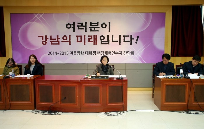 지난 20일 신연희 서울 강남구청장이 구청 회의실에서 행정체험에 참여한 대학생들과 함께 ‘2014~2015년 겨울방학 대학생 행정체험연수자 간담회’를 열고 연수기간의 애로사항 및 의견을 듣고 있다.(사진제공=강남구청)