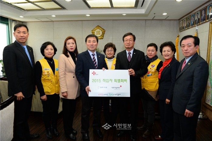 서울 중랑구의회는 지난 20일 구의회 6층 의장실에서 2015년 적십자 특별회비를 전달했다. 사진은 이 자리에 참석한 서인서 의장(왼쪽 네번째)을 비롯해 조희종 부의장(제일 오른쪽) 및 구의원들과 대한적십자사 서울특별시지사 김명호 사무처장(오른쪽 네번째), 적십자 관계자들의 모습. (사진제공=중랑구의회)