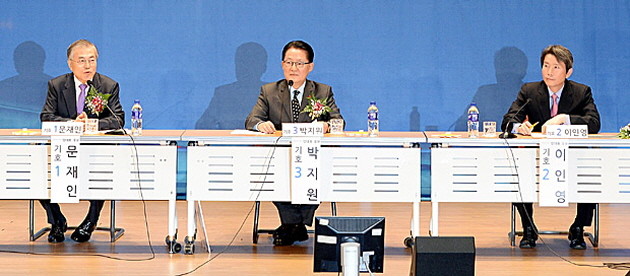 21일 오전 서울 여의도 국회 의원회관에서 새정치민주연합 보좌진협의회가 주최한 ‘당대표 후보 초청 토론회’가 열린 가운데 후보들이 모두발언을 하고 있다. 왼쪽부터 문재인, 박지원, 이인영 후보.