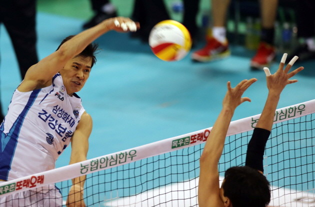 LIG 세터 노재욱(23)은 세트스코어 1-1로 맞선 3세트 10-10에서 김진만의 리시브가 네트를 넘어가려하자 한 손으로 이를 걷어 올렸다.