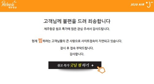 제주항공 홈페이지에는 "고객님께 불편을 드려 죄송합니다. 제주항공 원조 특가에 많은 관심을 주셔서 감사드립니다. 현재 찜하려는 고객님들의 큰 사랑으로 사이트 접속이 지연되고 있습니다. 잠시만 기다려 주십시요. 감사합니다"라고 적혀있다.