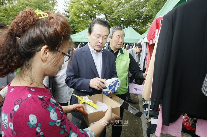 | ▲ 자원재활용과 나눔을 촉진하기 위해 열리는 매주 '까치나눔장터'를 방문해 물건을 살펴보는 노현송 강서구청장(가운데)의 모습.(사진제공=강서구청) | ||