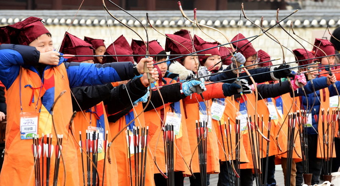 국궁체험하는 어린이들