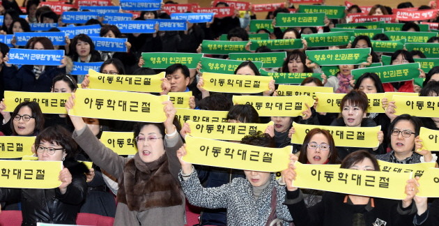 경기 수원지역 어린이집 원장 500여명이 22일 오후 수원시청에 모여 아동학대 예방 실천 결의대회를 열어 '아동학대 근절', '영유아 인권존중', '안전사고 예방', '보육교사 근무환경 개선' 등을 외치고 있다.