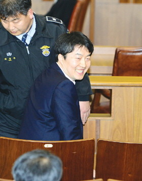 이석기 전 통합진보당 의원이 22일 서울 서초동 대법원에서 열린 ‘내란음모’ 사건에 대한 상고심 선고공판에 참석해 방청객들을 바라보며 웃고 있다.