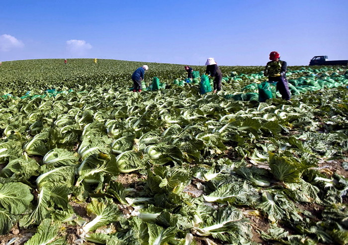 전남 해남군은 겨울배추의 수급안정을 위해 추진한 시장격리 등 선제적 대응이 주효하면서 이달 중순 이후 포전거래가 활발하게 이뤄지고 있다고 23일 밝혔다. 사진은 전국 최대 겨울배추 산지인 산이면 일대 밭에서 배추를 수확하는 모습.