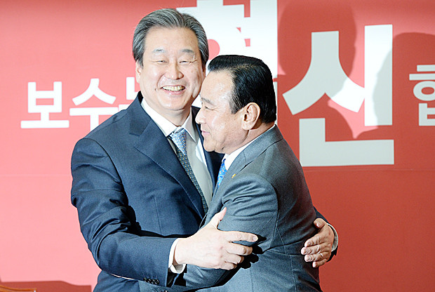 이완구 국무총리 내정자(오른쪽)가 23일 오전 서울 여의도 국회 새누리당 당대표실을 찾아 김무성 대표와 포옹을 하고 있다.