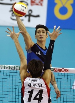 | ▲ 경북 구미시 박정희체육관에서 열린 2014-2015 V리그 4라운드 남자부 LIG손해보험과 현대캐피탈의 경기에서 현대캐피탈 문성민이 LIG손해보험 김진만의 블로킹을 피해 공격을 시도하고 있다./뉴시스 | ||