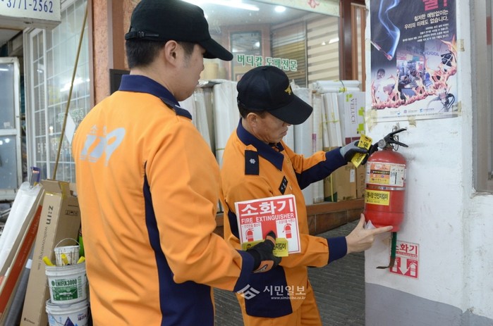 최근 서울 영등포소방서가 지역내 전통시장을 방문해 숨어있는 소화기를 잘 보이는 곳에 설치하는 '보이는 소화기 설치' 행사를 실시하고 상인들을 대상으로 화재가 발생했을 때 소화기를 사용하는 방법을 교육했다. 사진은 소화기를 설치 중인 소방대원들의 모습. (사진제공=영등포소방서)