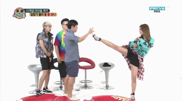 특히, 주간아이돌에서 정형돈의 손바닥을 향해 발차기를 날려 정형돈을 깜짝 놀라게 하기도 했다.