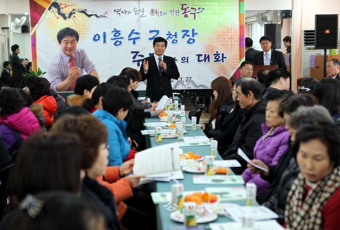 인천 동구가 27일 현안사업을 중심으로 주민들의 다양한 의견을 듣고 구정에 대한 주민들의 궁금증을 해소하기 위해 구청장이 국·과장 등 간부들과 함께 동 주민센터를 방문하는 '주민과의 대화'를 마무리했다. 사진은 최근 화수2동에서 진행된 주민과에 대화에 참여한 이흥수 구청장의 모습. (사진제공=동구청)