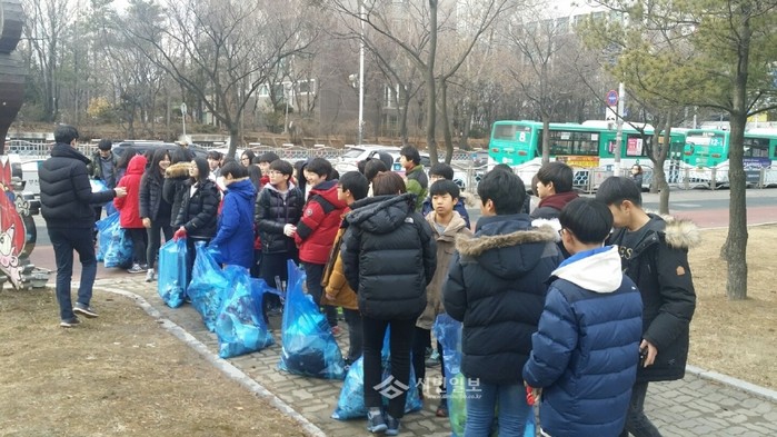 최근 경기 부천시 원미구 중1동의 '청소년 제설자원봉사단'이 현대백화점·롯데백화점 주변 먹자골목 지역을 중심으로 1500리터 분량의 쓰레기를 수거하는 환경정비활동을 실시했다. 사진은 환경정비활동에 참여한 청소년 봉사자들의 모습. (사진제공=부천시청)
