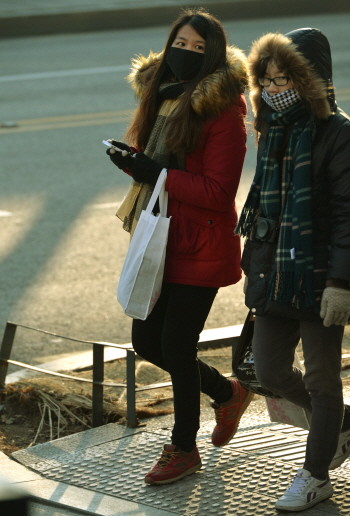 전국이 맑은 가운데 중국의 찬 대륙고기압 확장으로 북서쪽 찬 공기가 남하하고, 바람이 강하게 불면서 체감온도가 뚝 떨어진 27일 오전 서울 종로구 효자로에서 두터운 옷을 입은 관광객이 발걸음을 옮기고 있다.