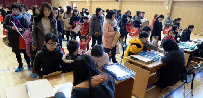 2015학년도 초등학교 신입생 예비소집이 진행된 27일 전북 전주시 만성동 만성초등학교에서 학부모와 자녀들이 신입생 안내 자료를 받으며 설명을 듣고 있다.