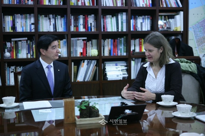 최근 독일 탈원전정책을 주도적으로 이끌어낸 독일 베를린자유대학 미란다 슈로이어 교수가 강동구를 방문해 이해식 구청장과 에너지 정책에 대한 대담을 나누고, 십자성 에너지 자립마을을 방문해 에너지 자립을 위해 설치된 설비들을 둘러봤다. 사진은 대담 중인 이 구청장(왼쪽)과 슈로이어 교수(오른쪽)의 모습.(사진제공=강동구청)