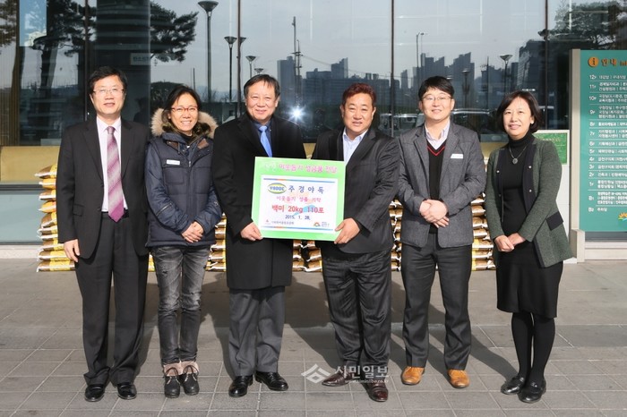 28일 서울 금천구가 구청 광장에서 '사랑의 물품 나눔행사'를 열고 (주)주경야독으로부터 20kg 쌀 110포를 후원받았다. 이 쌀은 지역내 저소득 가정을 지원하는 데 사용될 예정이다. 사진은 전달식에 참여한 차성수 구청장(왼쪽에서 세번째)과 윤동기 (주)주경야독 대표(오른쪽에서 세번째), 주경야독 관계자들의 모습.(사진제공=금천구청)