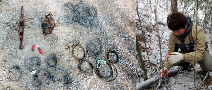 무등산국립공원동부사무소는 28일 국립공원 지정 이후에도 야생동물 밀렵행위가 끊이지 않음에따라 오는 3월까지 집중단속을 벌인다고 밝혔다. 사진은 국립공원사무소 관계자가 올무를 제거하고 있는 모습.