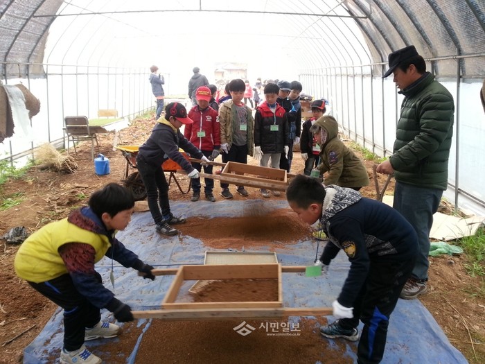 | ▲ '못자리 만들기 체험'을 하고 있는 아이들의 모습. (사진제공=서대문구청) | ||