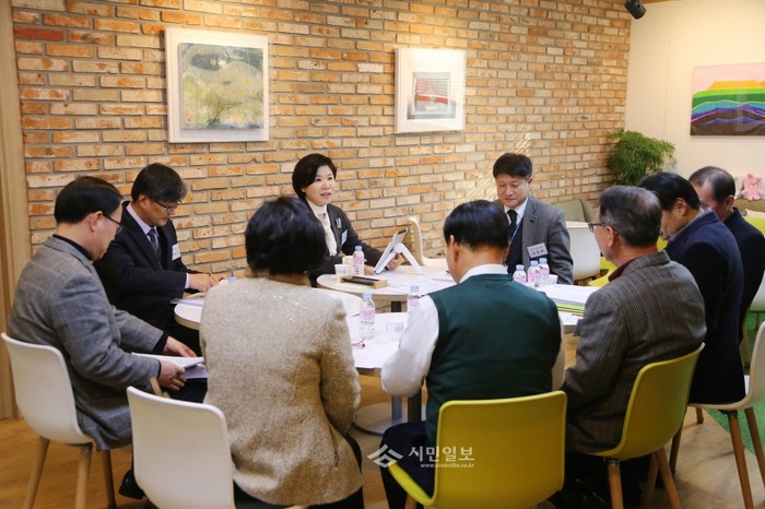 매주 월요일마다 서울 서초구 5층 상상카페에서 열리는 ‘은희씨와 속 시원한 오후3시’ 에 참가한 조은희 구청장(벽면 가운데)과 관련부서 직원들이 주민들과 함께 면담을 진행하고 있다.(사진제공=서초구청)