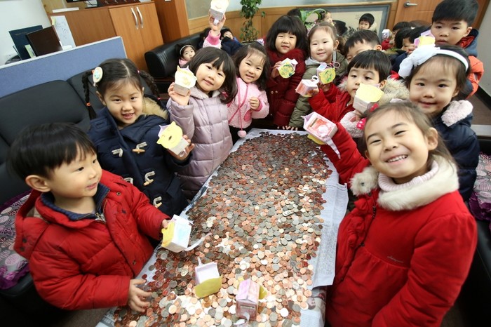 30일 송파구 삼전동 주민센터에서 '사랑의 저금통' 전달식이 열렸다. 이날 전달식에서는 '라온몬테소리 어린이집' 원생들이 지난 1년간 정성으로 모은 성금 15만원을 기탁했다. 사진은 라온몬테소리 어린이집 원생들이 저금통에 모은 동전과 함께 기념촬영을 하는 모습. (사진제공=송파구청)